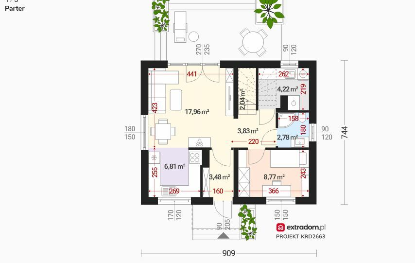 Salon z wyjściem na taras, 4 pokoje, 2 łazienki, przedpokój oraz praktyczne pomieszczenie gospodarcze